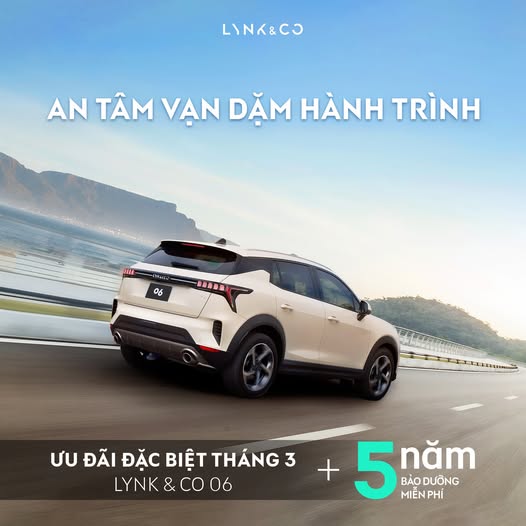 Với Lynk & Co 06, sự an tâm ấy được duy trì lâu dài thông qua chính sách chăm sóc xe bài bản và hệ thống dịch vụ chính hãng. Nhờ đó, chiếc xe luôn sẵn sàng đồng hành cùng bạn trên mọi cung đường - từ những chuyến đi thường ngày đến các hành trình dài phía trước. Trong tháng 03/2026, Lynk & Co 06 còn đi kèm ưu đãi đặc biệt dành cho khách hàng an tâm sở hữu: